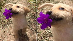 This adorable dog gets his owner a flower as a gif...